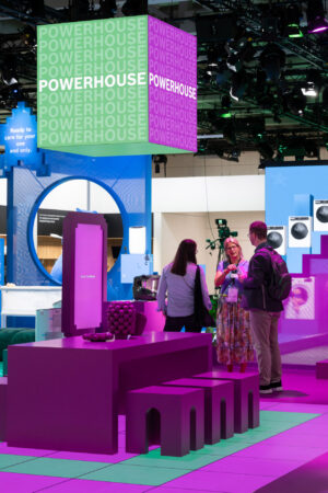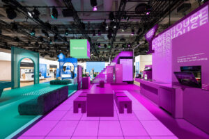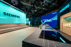 Der eher museale Charakter der Präsentation für SIEMENS und der Messestand für Bosch mit klassischen Elementen und dem Powerhouse in der Mitte.